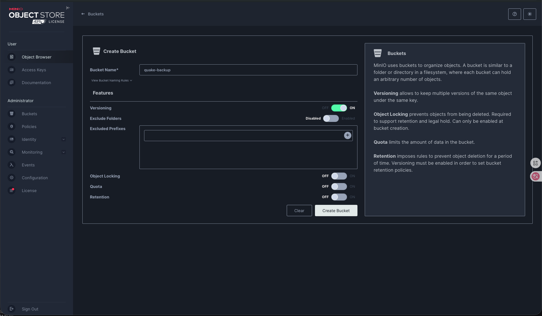 在服务器本地点击新建一个桶,记得一定打开版本,versioned